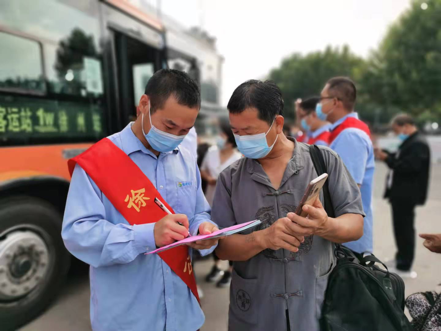 在活動(dòng)現(xiàn)場(chǎng),志愿者們積極行動(dòng),一邊引導(dǎo)車輛規(guī)范進(jìn)站,一邊疏導(dǎo)乘客有序上下車,解答乘客提問(wèn),并幫助乘客調(diào)取健康碼行程碼,方便市民乘車。