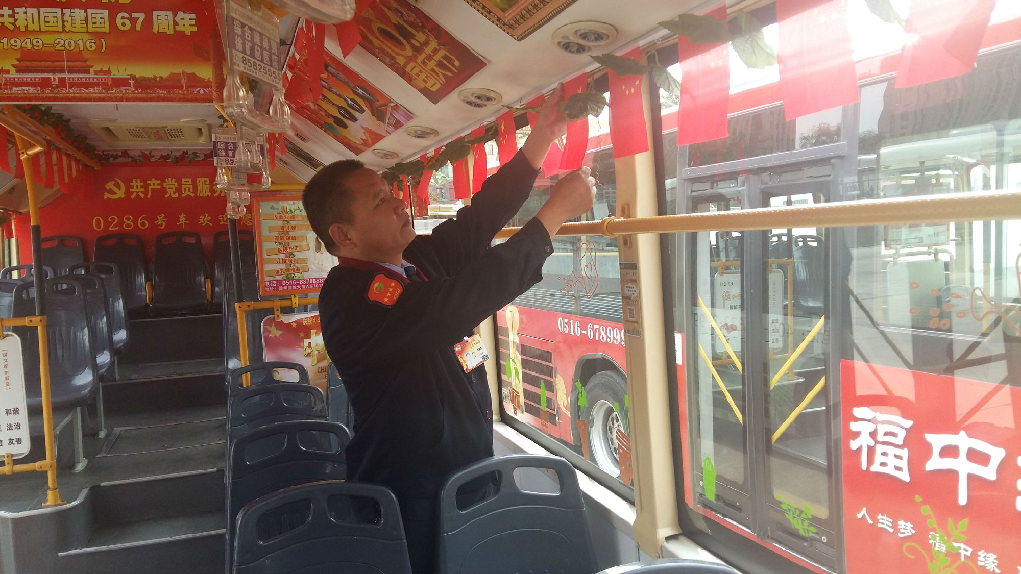 公交駕駛工作平凡、枯燥,但曹瑞國愛動腦、喜創(chuàng)新,總會給乘客不一樣的驚喜,感受不一樣的出行服務。適逢節(jié)日、活動,他總會換著花樣地自掏腰包,給車上乘客一個驚喜:春節(jié),購置小紅燈籠掛滿整個車廂,給乘客帶來濃濃的年味;母親節(jié),他準備了100支康乃馨、祝???,送給“媽媽級”女乘客,道上一聲由衷的問候;今年七一,為慶祝建黨95周年,他準備了95面黨旗,95本黨章,以及黨徽、紀念章給乘客,并在車廂廣播入黨宣言、革命紅歌;9月22日宣傳世界無車日,他制作了10個卡通宣傳牌,加班安裝在車廂四周,號召市民選用綠色交通工具出行,減少城市污染;十一,他將一百面國旗掛在車廂內,被媒體稱為“國旗哥”;10月9日重陽節(jié),為老年乘客發(fā)放免費鞋墊……