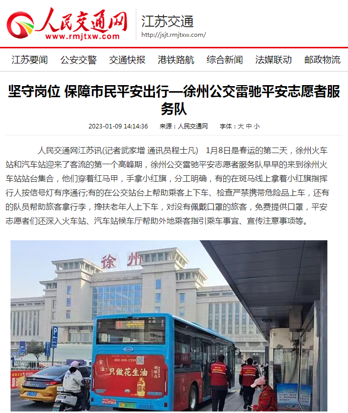 1月9日,人民交通網(wǎng)刊發(fā)文章《堅(jiān)守崗位 保障市民平安出行—徐州公交雷馳平安志愿者服務(wù)隊(duì)》
